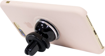 Ø 3 x 5 cm. Soporte magnético para celular. El adaptador se puede incorporar a la rejilla del aire acondicionado del auto y se adapta a cualquier tamaño. El agarre del celular es por medio de imán, sólo se debe colocar una placa de metal en el celular. En la placa de metal es donde se aplica el logo.