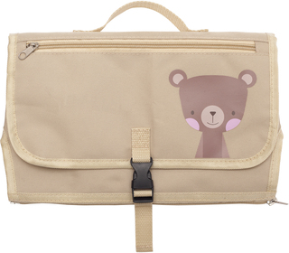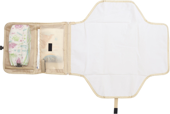 Abierto 92 x 29 cm. Cerrado 20 x 29 cm. Polyester. Cambiador para bebes alcolchado. Bolsillos internos para guardar pañales y toallitas. Un bolsillo externo con cierre. Correa que permite colgarlo en carro del bebe y bolso materno.