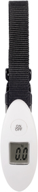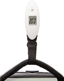 10,5 x 2,6 cm. Plástico. Balanza digital de mano, botón de off/on. Cuenta con una correa para enganchar en la manilla de la valija/bolso al elevar devuelve el peso. Peso máximo soportado 40 Kg.
