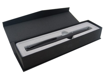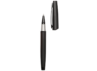 Metal. Lápiz roller. Cuerpo de color negro mate, clip con detalles en color negro brillante. Tinta negra. Con estuche de cierre imantado.