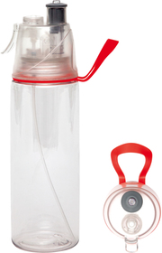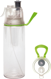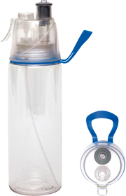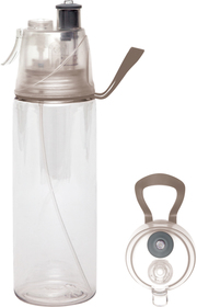 Ø 6,5 x 18 cm. Capacidad 550 ml. Plástico. Tapa plástica a rosca, boquilla deportiva engomada y rociador con gatillo que tira una suave lluvia. Correa de color.