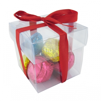 Caja de mica con cinta de regalo, que contiene deliciosos malva choc.