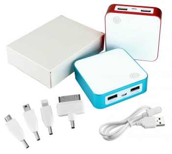 Power Bank cargador USB de plástico ABS con borde metálico. Capacidad 8400mAh. Incluye cable USB + 4 adaptadores para iPhone, Samsung Galaxy, Mini-USB, etc. BaterÃa recargable incorporada. Presentación en caja blanca de regalo. Incluye Manual de Uso (01)
