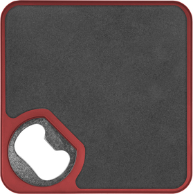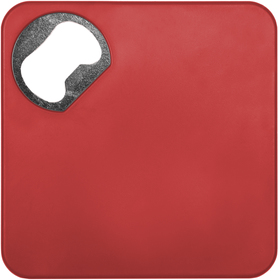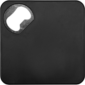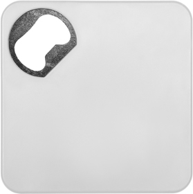 8 x 8 cm. Plástico. Destapador y posavaso, en uno de los lados cuenta con material E.V.A que se utiliza como antideslizante y protege la mesa, mantel o barra donde se apoya. Métodos de impresión: