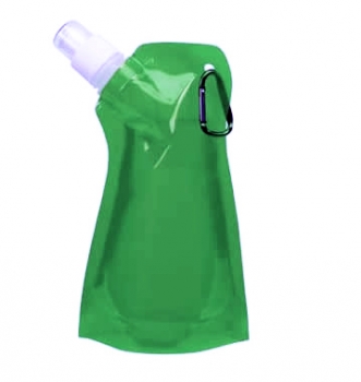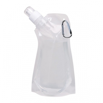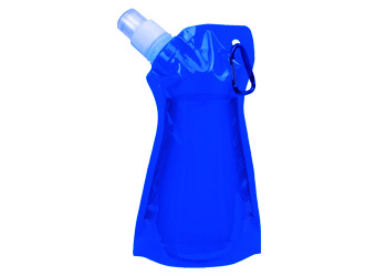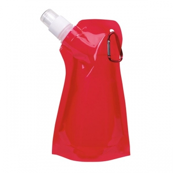 23 x 14 x 3,5 cm. Plástico. Botella de agua con tapón y mosquetón, vacÃa se puede plegar para ganar espacio, capacidad aproximada 480 ml. 02