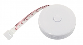 Ø 5 cm. huincha métrica de 1,5 m. Plástico. con botón de bloqueo que permite marcar medida y liberar cinta. Escala de medida en cm y pulgadas.2