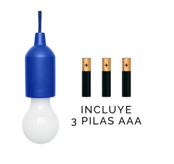 80 cm (largo del cordón). Plástico. Lampara con luz led. Contiene un lazo que al tirarlo enciende y apaga la luz de la bombilla. Utiliza 3 baterÃas AAA incluidas.