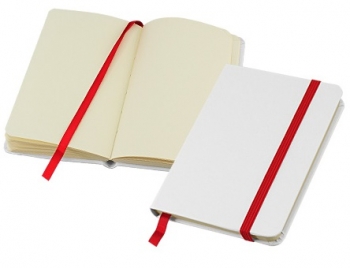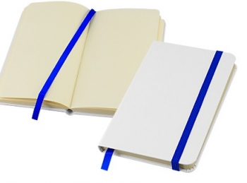 Libreta modelo "Whiteskine" tamaño A6, con cubierta de cartón piedra forrada en PU simil cuero blanco de 1.5mm de espesor. Interior 80 hojas limpias amarillas de 80gsm. Incluye banda elástica y huincha separador de hojas de color. Presentación individual en bolsa de polipropileno.