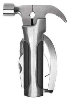 Martillo multifunción que contiene cuchillo, sierra, abrelatas, destapador, destornillador plano , destornillador Philips y martillo pinza con saca clavos. Funda con cierre de velcro.