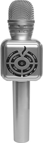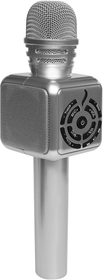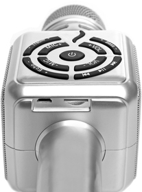 25 x 6,5 cm. Plástico. Microfono Karaoke. Funciones: micrófono que permite seleccionar diferentes tipos de voces presionando el botón de encendido, parlante y speaker. Botón de play, retroceso y avance, volumen, micrófono, triplicador y eco. Tarjeta TF.