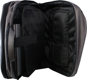 Poliéster 1680D. 30,5 x 10,2 x 38 cm. Capacidad 9,5 litros aprox.Porta Notebook de hasta 14 pulgadas. Dos compartimentos principales y un compartimento al frente. Correas ajustables, permite usarse como mochila o como cartera. Salida para auriculares.