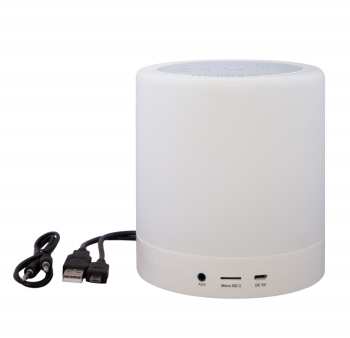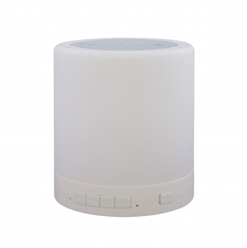 Ø 12 x 13 cm. Plástico. Bocina bluetooth para reproductores de MP3, smartphone, Iphone y tarjeta TF. Luz con tres niveles de intensidad con encendido táctil en la parte superior. Función manos libres. Potencia musical de 5 Watt. Botón de play, avance y retroceso. Cable de audio y cable Micro USB de 72 cm aprox. Incluye manual.