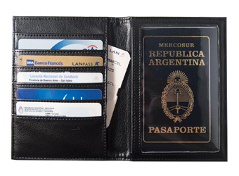 14,5 x 10,5 cm. SÃmil Cuero. Porta pasaporte. 2 compartimentos principales, 1 en PVC traslúcido. 6 compartimentos para tarjetas.(02)