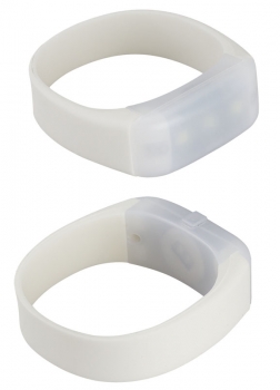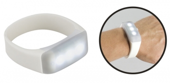 Pulsera de Silicona blanca, con 3 luces LED blancas. Función luminosa fija y estroboscópica. Ideal para deportistas. Presentación en cajita de cartulina blanca.