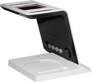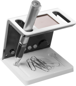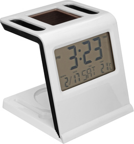 8 x 8 cm. Plástico. Reloj solar y porta lápices. Reloj, mes, fecha, dÃa y temperatura. Dos compartimentos para lápices pasta y espacio para guardar clips.