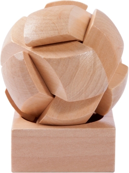 Ø 7,2 cm. Base 5,3 x 5,3 x 2,4 cm. Madera. Rompecabezas en forma de pelota.