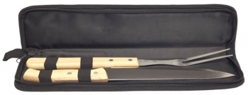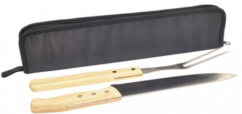 Set de cuchillo y tenedor con mango de madera. Estuche de polyester con cierre.