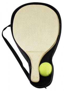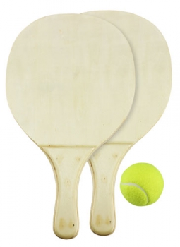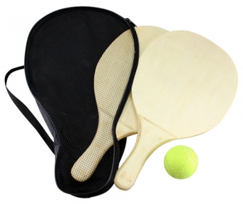 Set de 2 Paletas de Playa de madera terciada 9mm., barnizadas color natural. Incluye pelota de tenis. Presentación en bolso de tela ecológica TNT negra y malla, con colgador.