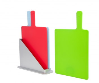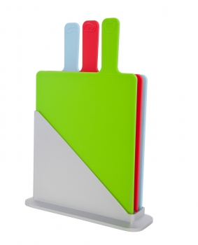 23,5 x 19,6 cm. Plástico. Set de tres tablas para picar, una para cada alimento, con una base para poner las tablas y mantenerlas ordenadas.