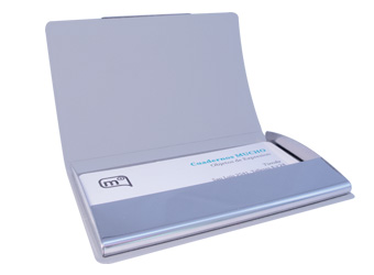9,5 x 6,5 x 1,1 cm. Plástico y Metálico. Exterior de vinilo texturado con amplia placa metálica para impresión. Interior en metal. Cierre imantado. 02