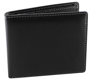 Billetera de PU. Presentación en caja de regalos de cartón forrado negro.