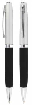 BolÃgrafo Metálico bicolor modelo \"Chairman\". Cuerpo inferior superficie engomada negra, cuerpo superior plata satinado, terminales cromados. Escritura negra.(1)