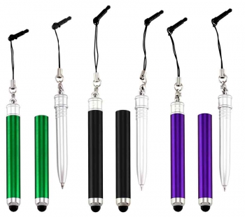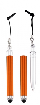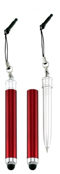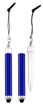 BolÃgrafo \"Touch-Screen\" con cuerpo plateado, tapa de color metalizado y goma posterior negra para pantalla táctil. Incluye práctico soporte plástico para insertar en la salida de auricular del iPhone. Escritura azul.