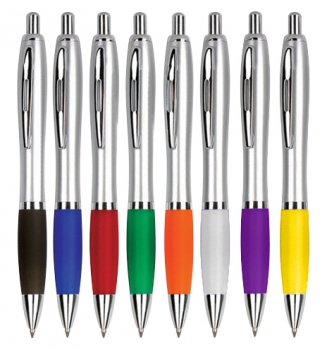 BolÃgrafo plástico plateado con goma de color, modelo \"Wind Satin\". Escritura Azul. El BolÃgrafo más famoso del mundo.