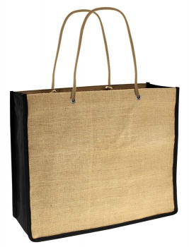 Bolso Ecológico de Yute natural con fuelle y fondo en tela PET color negro. Cuenta con 2 asas de nylon color natural de 50cm. c/u aprox. (1)