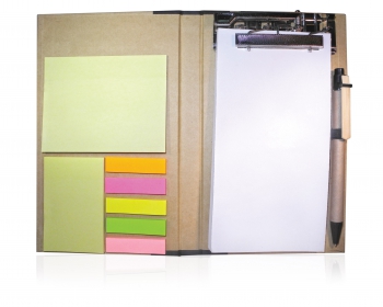 Cartón semirÃgido. Incluye block de hojas, 7 blocks adhesivos rectandulares, presilla porta lápiz pasta y lápiz pasta a tono con pulsador y puntera plástica, clip de madera y pasta negra. Gancho metálico sujetador de block de hojas. (2)