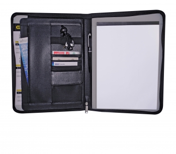 51 x 34 x 25 cm. Exterior de Nylon, microfibra y detalles en sÃmil cuero y metal. Interior: compartimento, bolsillo con cierre, tarjetero, porta bolÃgrafos elástico y hojas A4 lisas. (2)
