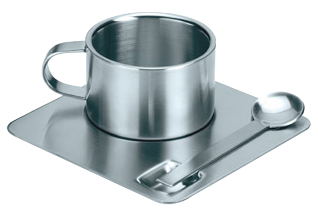 Coffe Set modelo \"Espresso\", 100% Acero Inoxidable. Incluye taza, plato y cuchara. Presentación en elegante caja de regalo plateada.