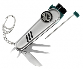 Cortaplumas de Golf de Acero Inoxidable con 7 funciones. Incluye Cuchillo, Levanta-Pique corto, Levanta-Pique largo, Cepillo, BolÃgrafo tinta negra, Marcador magnético y llavero. Presentación en caja de regalo plateada.(1)