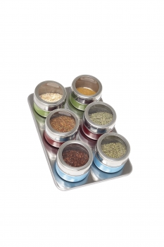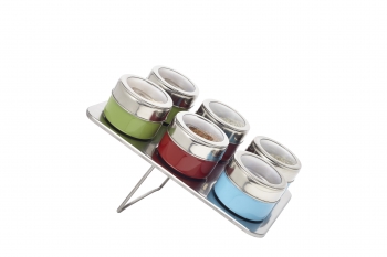 23 x 15 cm (Base) Ø 6 x 4 cm (Cada especiero). Acero inoxidable. Set de 6 Especieros imantados de color con base metálica contiene un pÃe que permite elevarla.