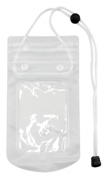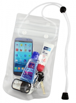 Guardatodo impermeable de PVC clear con colgador ajustable de cordón blanco. Incluye doble sistema de cierre: zipper doble y broches. Ideal para playa y piscinas