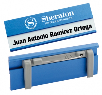Identificador de Aluminio \"Bindel\", con ventana para insertar nombre-cargo-empresa. Incluye clip posterior para colgar en el bolsillo y alfiler de gancho para enganchar en cualquier prenda. (1)