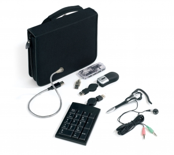 Headset, lámpara led flexible USB portátil, multipuerto USB con 4 puertos, mouse óptico y keypad numérico. Estuche con cierre y con manija para transportar.(2)