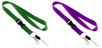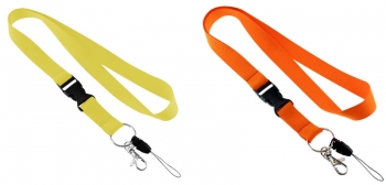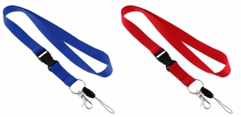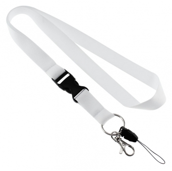 Lanyard Porta-Credencial y Accesorios de Polyester liso de 2 cm. de ancho para sublimación. Incluye tip-top plástico negro, mosquetón metálico y cordón negro porta-celular y accesorios. Medidas Lanyard: 2 x 90 (80 + 10) cm.