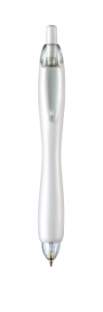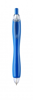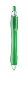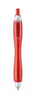 Plástico. Cuerpo curvo y pulsador de color. Clip y puntera transparentes. Pasta negra.