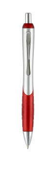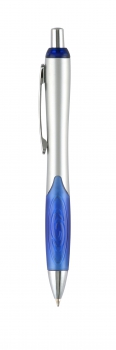 Plástico. Cuerpo, pulsador, clip y puntera color plata. Grip de goma de color. Detalles de color. Clip metálico. Pasta negra. DETALLE METÁLICO.