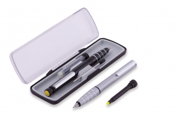 Metal. Cuerpo de color. Detalles en color plata. Clip y puntera metálicos. Apertura giratoria. Pasta negra. Incluye resaltador en parte superior con apertura giratoria, 1 repuesto de pasta negra y 1 repuesto de resaltador. Estuche plástico con tapa transparente.(2)