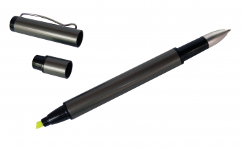 Metálico. Clip color plata. Detalles en color negro. 2 tapas. Resaltador fluo amarillo. Pasta negra. METAL.(2)