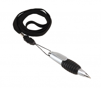 Plástico. Cuerpo color plata. Apertura giratoria. Cordón de seguridad para cuello. Desmontable. Grip de goma de color. Pasta negra.
