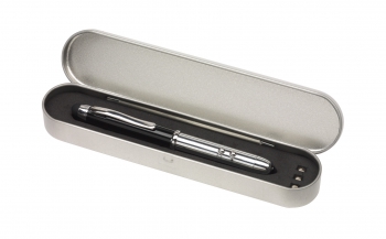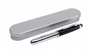 Metálico. Puntero laser, luz LED y punta \"touch\" para pantallas táctiles. Incluye las baterías más tres baterías de repuesto.