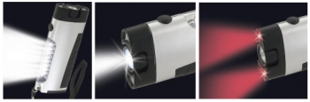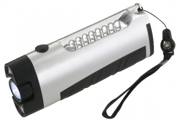 Linterna LED 4-en-1. Incluye Linterna 1 LED + Lámpara 8 LED + Estroboscópica roja de emergencia + Mini-Brújula en huincha negra removible para transportar. Pilas: 4 pilas AAA (no incluidas)(1)