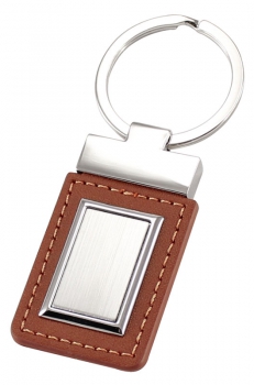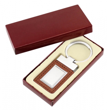 Llavero de Cuero Café con ventana rectangular metálica. Presentación en estuche laminado café con cuna aterciopelada.(1)
