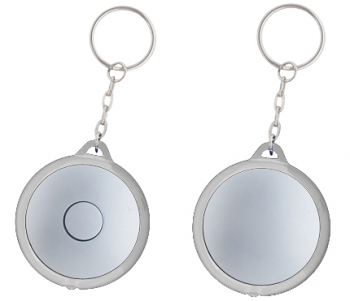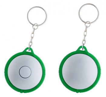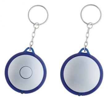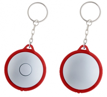 Llavero-Linterna LED redondo, con cuerpo plateado y anillo (borde) de color traslúcido.(1)