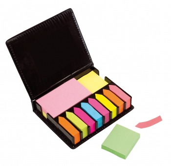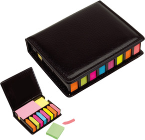Cuerina negra. 8 Blocks autoadhesivos de diferente color en forma de flecha. 2 Blocks autoadhesivos rectangulares de diferente color. 2 Blocks autodhesivos cuadrados de diferente color. (2)
