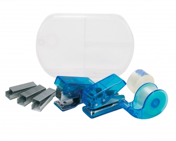 Plástico. Set de 1 corchetera, 1 perforadora y 1 repuesto de corchetes. Dispenser con cinta adhesiva más 1 repuesto. Caja plástica transparente.(2)