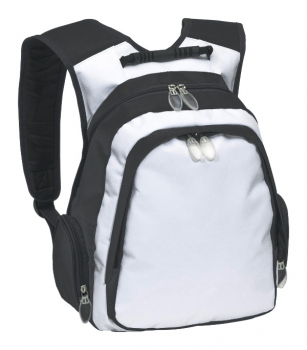 26 x 40 x 12 cm Compartimento principal y bolsillo frontal externo con cierre. 2 bolsillos laterales externos con cierre. Manija reforzada. Correas y parte posterior acolchadas. Deslizadores de cierre transparentes. Interior dividido. POLYESTER 600D.(2)